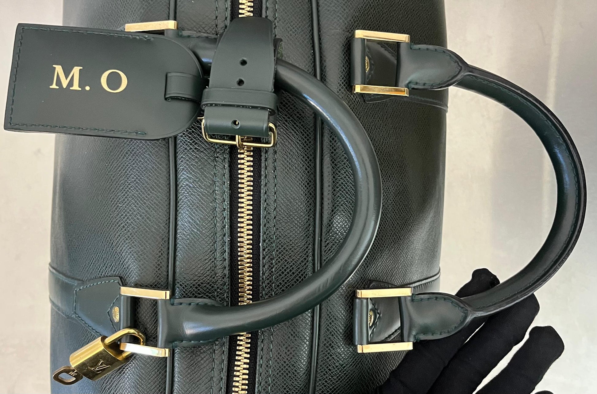 Zubehör: Schloss, Schultergurt, Namensschild mit Initialen M.O
